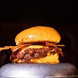 Nuestro pan brioche casero con 2 smash burger de carne de vaca, queso Oxaca, Monterrey y mozzarella, bacon americano crujiente, pepinillos, mermelada de tomate y salsa El Rancho
